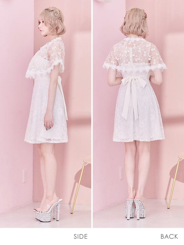 シアーフラワーケープ付きノースリーブウエストリボン総レースフレアミニドレス (Sサイズ~XLサイズ) (戦慄かなの/キャバドレス着用)