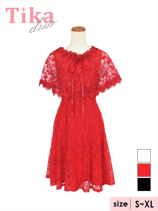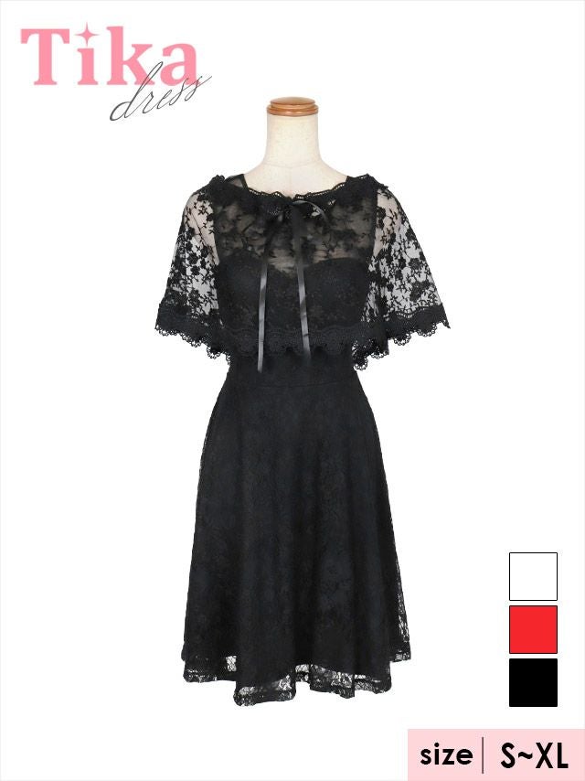 シアーフラワーケープ付きノースリーブウエストリボン総レースフレアミニドレスのカラーバリエーション