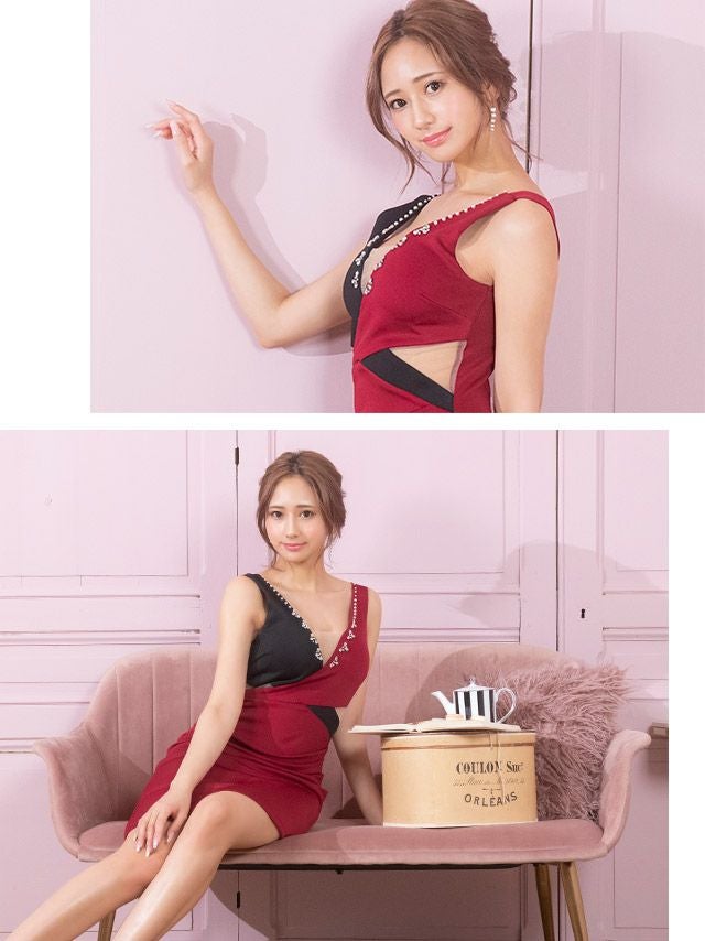 3. バイカラービジューくびれヌーディーカットアウトアシメノースリーブタイトミニドレス (Sサイズ~Lサイズ) (明日花キララ/キャバドレス着用)