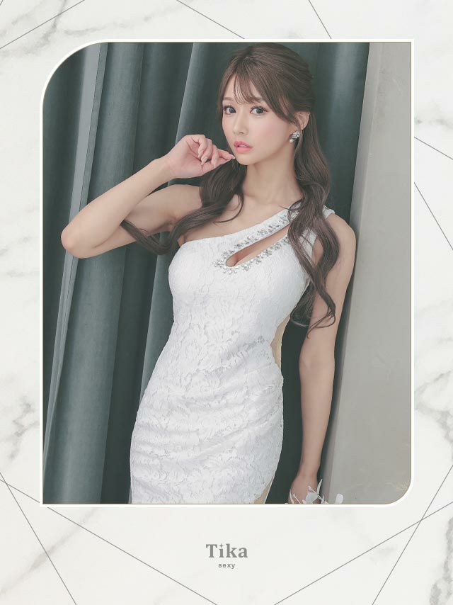 3. [SALE] タイト ミニドレス 谷間 大きいサイズ レース 大人 ワンショルダー バストカット フラワーモチーフ ビジュー 総レース (聖菜着用)