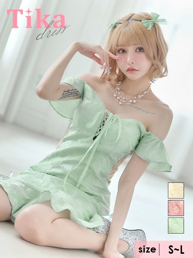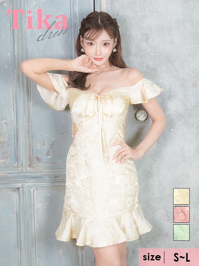 キャバドレス ミニ丈 大きいサイズ キャバクラ Tika ティカ オフショルダーバストレースアップジャガードフラワー裾フリルタイトミニドレス