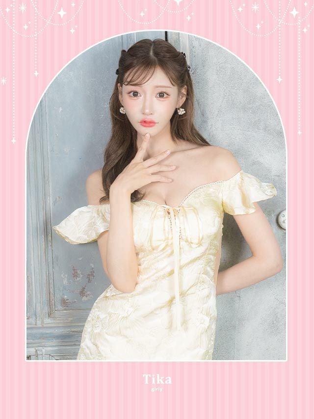 3. オフショルダーバストレースアップジャガードフラワー裾フリルくびれタイトミニドレス (Sサイズ~Lサイズ) (聖菜/キャバドレス着用)