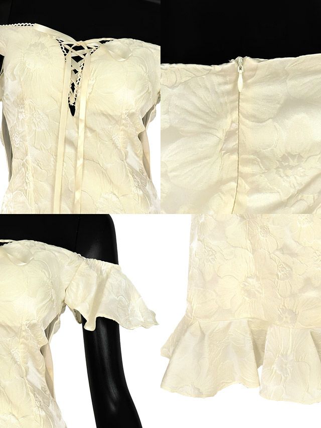 オフショルダーバストレースアップジャガードフラワー裾フリルタイトミニドレスの商品詳細1
