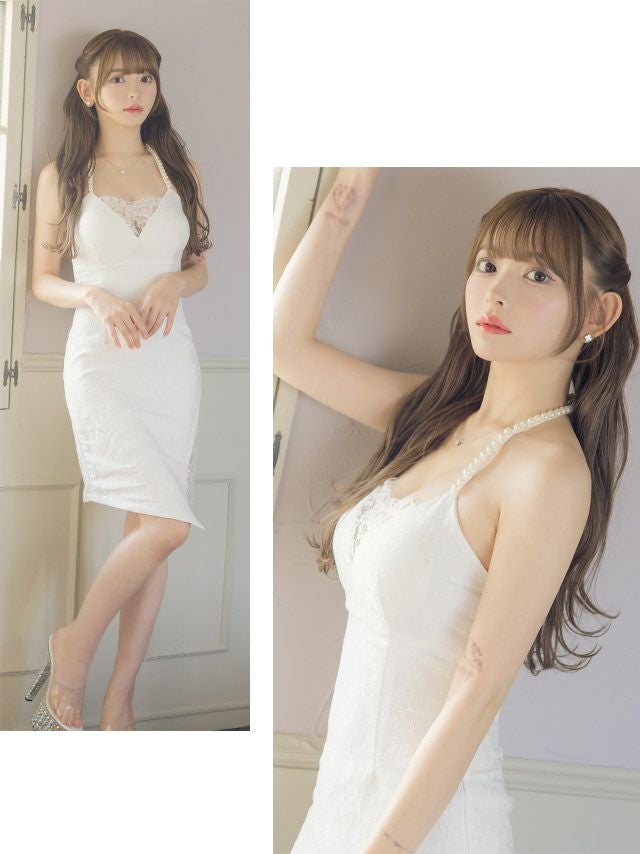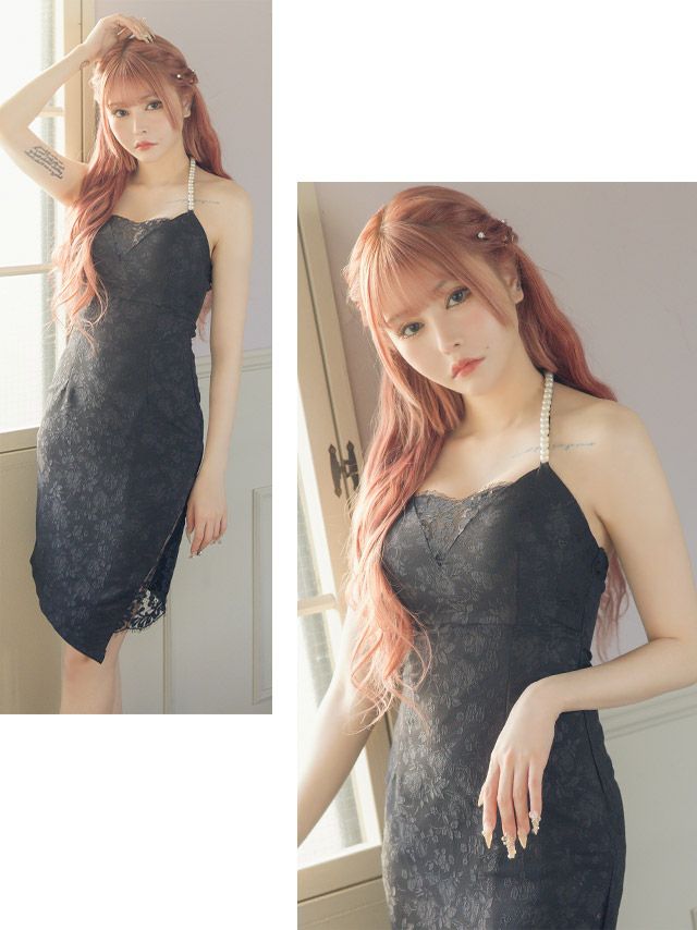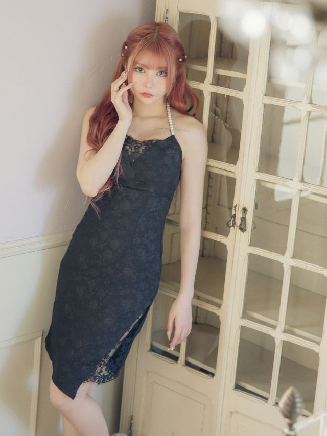 3. パールフラワー 総レース アシメホルターネック タイト膝丈ドレス (Sサイズ~Lサイズ) (黒崎みさ/キャバドレス着用)