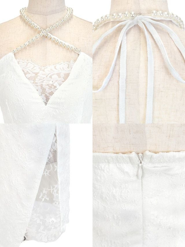 パールホルターネックフラワー総レースアシメ膝丈タイトドレスのメイン画像