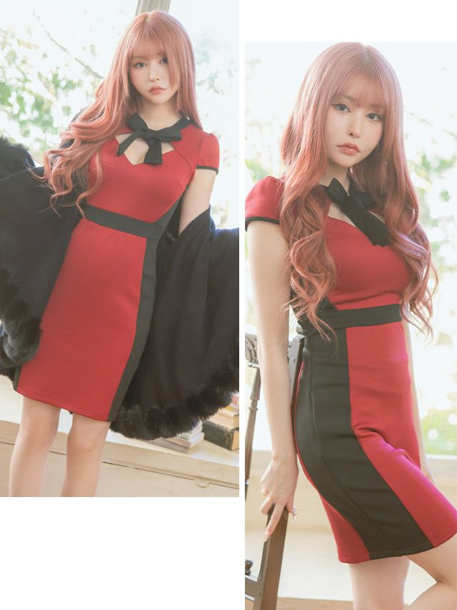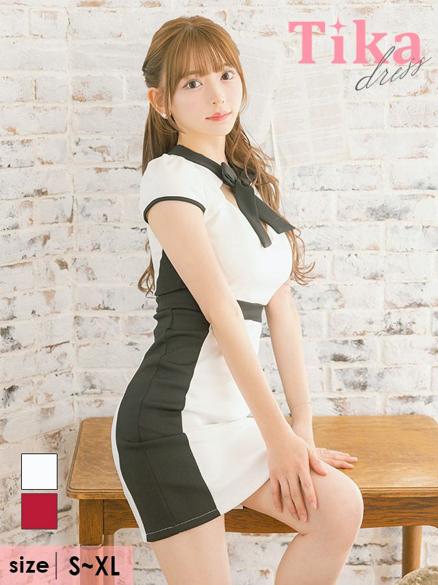 バイカラーデザインネックリボンカットアウトストレッチ半袖タイトミニドレス (Sサイズ~XLサイズ) (黒崎みさ/キャバドレス着用)