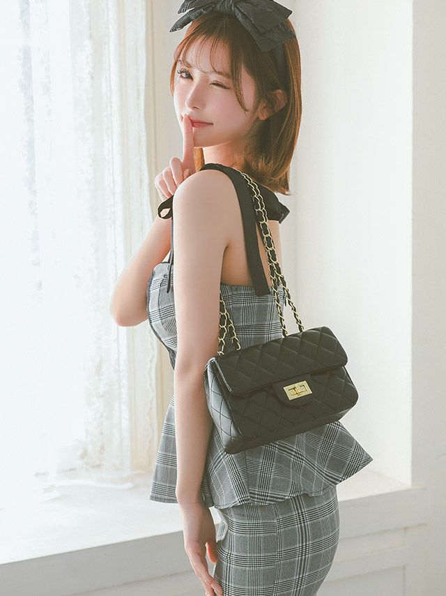 チェック柄レーステープボタンキャミソールリボンショルダーペプラムタイトミニドレスのサイドバッグ全身