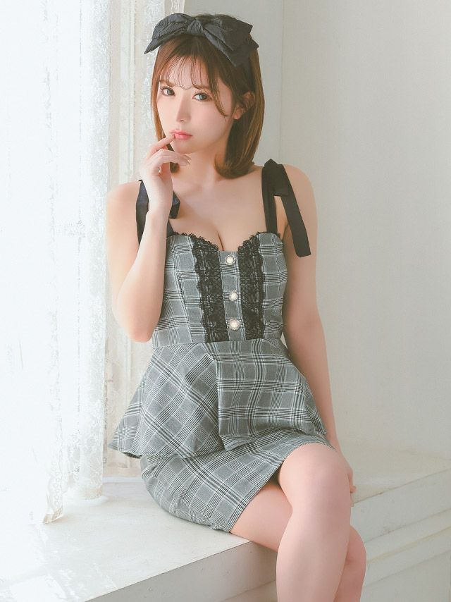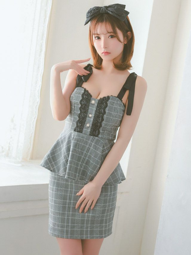 3. [SUPER SALE] チェック柄 レーステープ ボタン キャミソール リボンショルダー ペプラム タイトミニドレス (Sサイズ~XXXXLサイズ) (聖菜/キャバドレス着用)