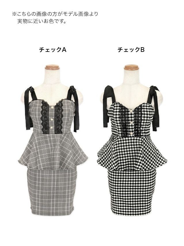 チェック柄レーステープボタンキャミソールリボンショルダーペプラムタイトミニドレスのカラーバリエーション