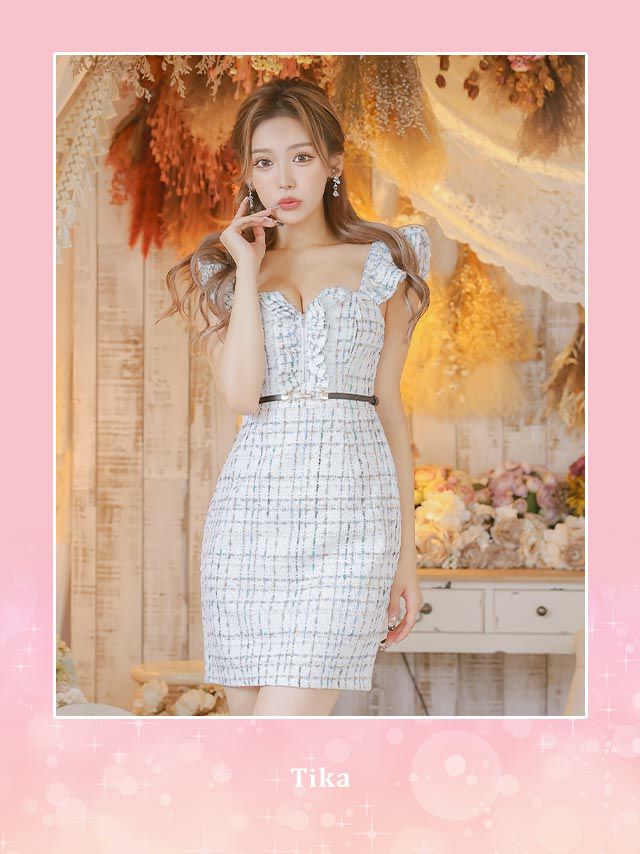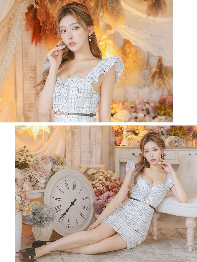 ツイード×チェック柄で映える♪ ベルト付きフリル袖チェック柄ツイードフロントジップノースリーブタイトミニドレス (Sサイズ~XXLサイズ) (せいせい/キャバドレス着用)
