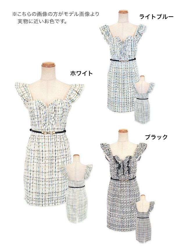 ベルト付きフリル袖チェック柄ツイードフロントジップノースリーブタイトミニドレスのカラーバリエーション