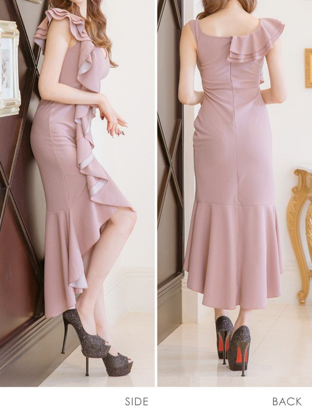 Vネックフリル袖ノースリーブマーメイド膝丈テールドレスのカラーバリエーション
