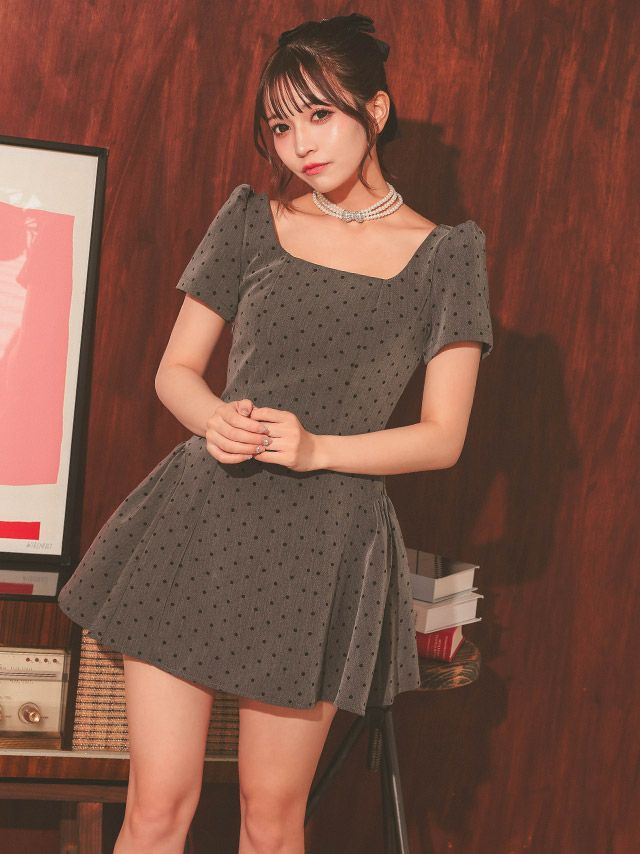 3. ワンピース Aライン ミニドレス 上品 ドット柄 半袖 パフスリーブ スクエアネック バックレースアップ ブラジャーのまま キャバドレス (若林萌々着用)