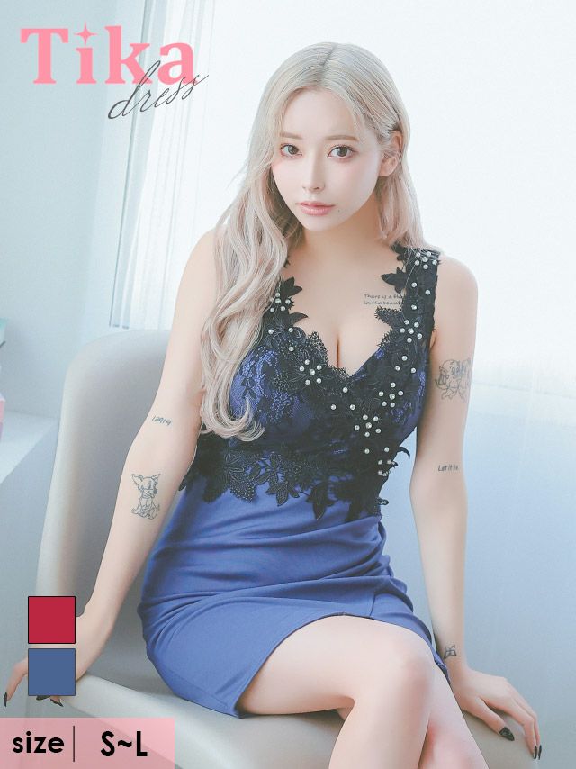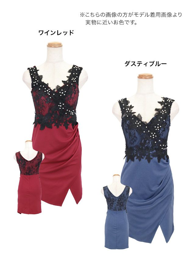 フラワー刺繍パール切替デザインギャザーラップノースリーブタイトミニドレスのカラーバリエーション