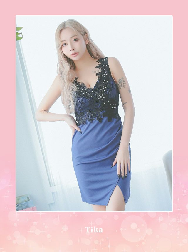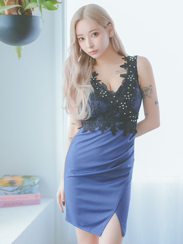 5. フラワー刺繍パール切替デザインギャザーラップノースリーブタイトミニドレス (Sサイズ~Lサイズ) (PyunA./キャバドレス着用)