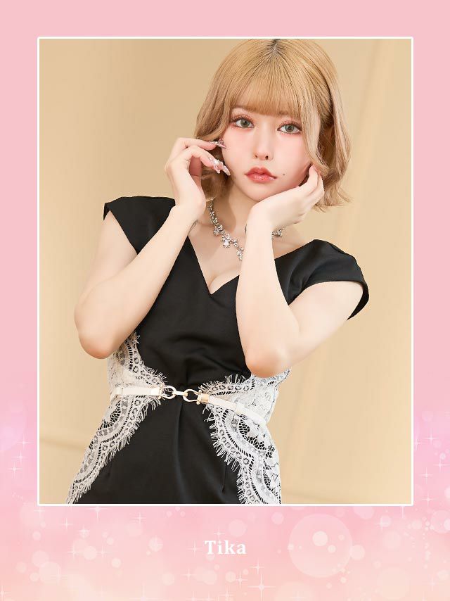 キャバドレス ミニ丈 大きいサイズ キャバクラ Tika ティカ Vネックノースリーブくびれスカラップレースベルトタイトミニドレス