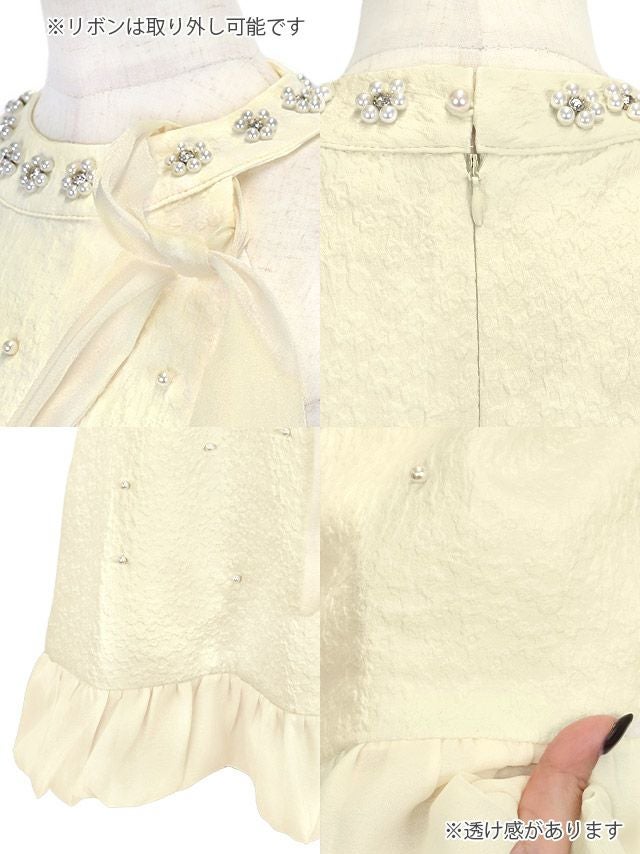 ワンピース Aライン ミニドレス ノースリーブ 上品 ハイネック ネックリボン シフォン フラワーストーン パール 裾フリル (の商品特徴1