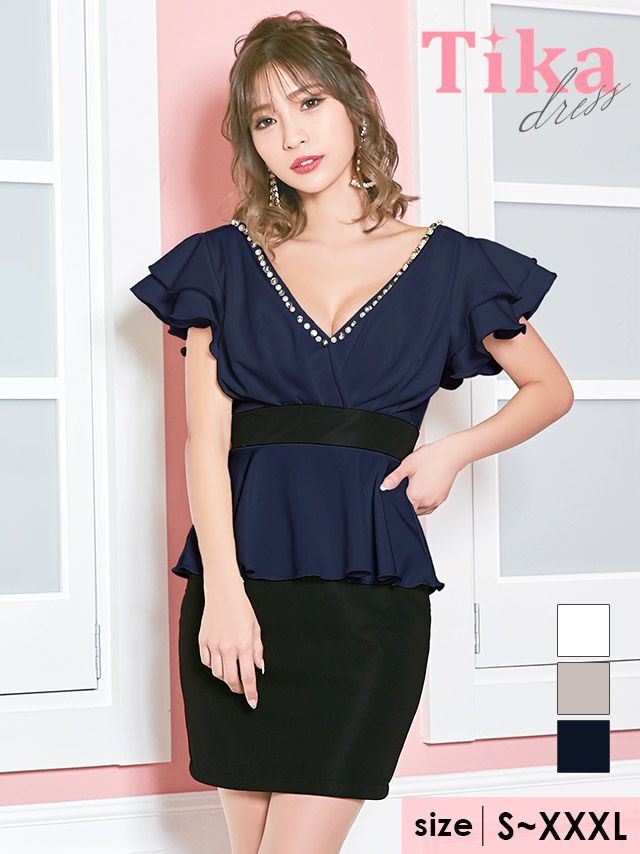 4. Vカット谷間魅せペプラム半袖タイトミニドレス (Sサイズ~XXXLサイズ) (石原彩香/キャバドレス着用)