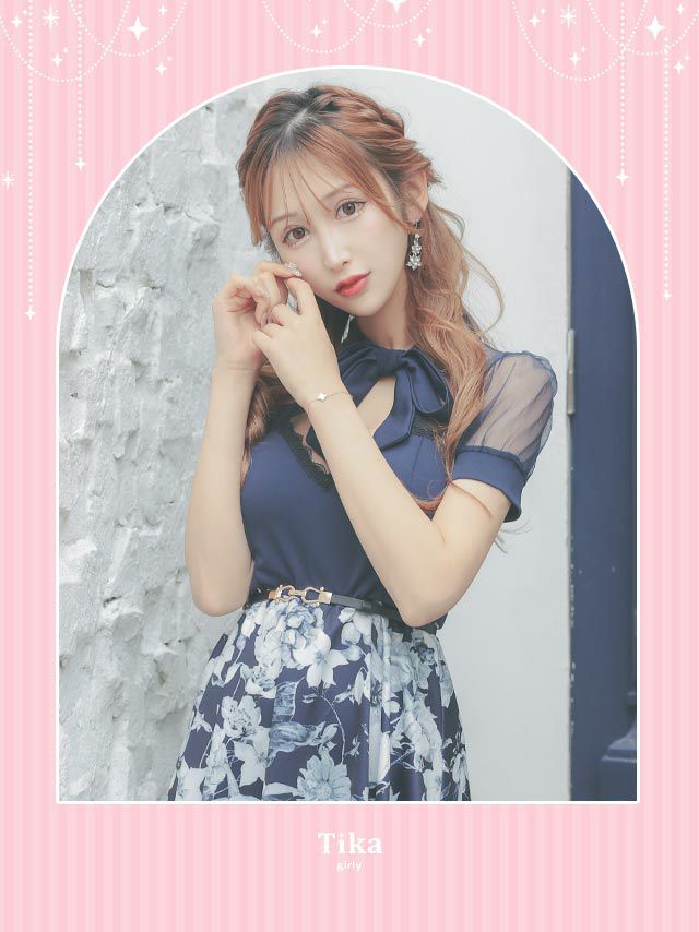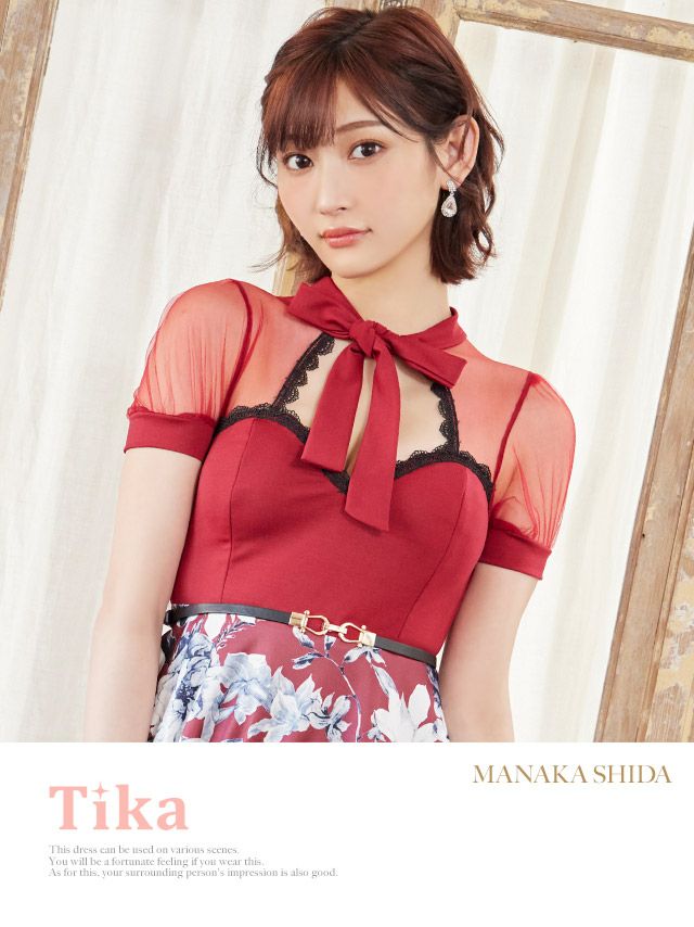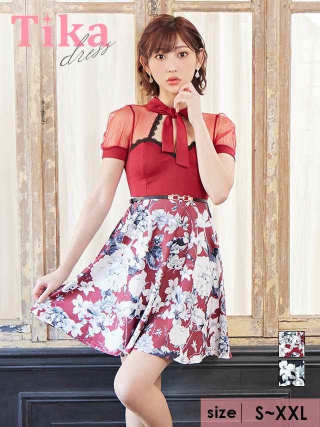 キャバドレス ミニ丈 Aライン 大きいサイズ Tika ティカ ウエストベルト付きネックリボン半袖シアーハートカットフラワープリントハイウエスト切替フレアミニドレス