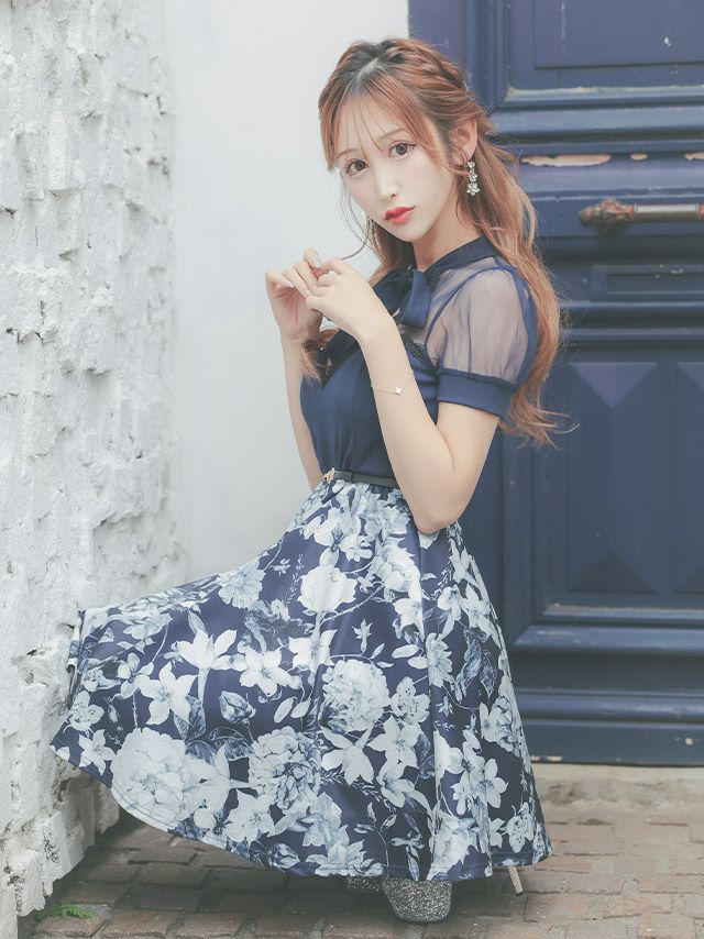 着るだけで気分がアガる♪ ウエストベルト付き半袖シアーハートカットフラワープリントネックリボンハイウエスト切替フレアミニドレス (Sサイズ~XXLサイズ) (浦西ひかる/キャバドレス着用)