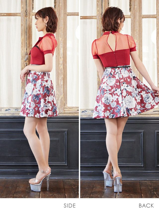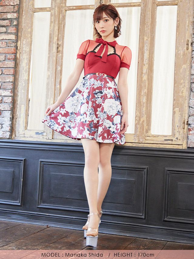 5. ウエストベルト付き半袖シアーハートカットフラワープリントネックリボンハイウエスト切替フレアミニドレス (Sサイズ~XXLサイズ) (浦西ひかる/キャバドレス着用)