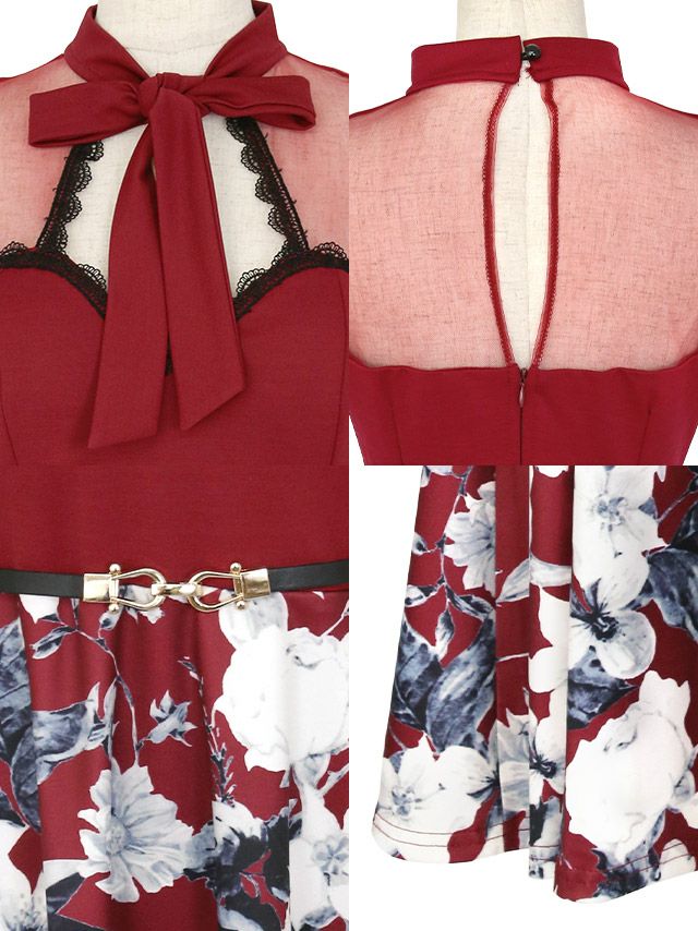 ウエストベルト付きネックリボン半袖シアーハートカットフラワープリントハイウエスト切替フレアミニドレスの商品詳細1