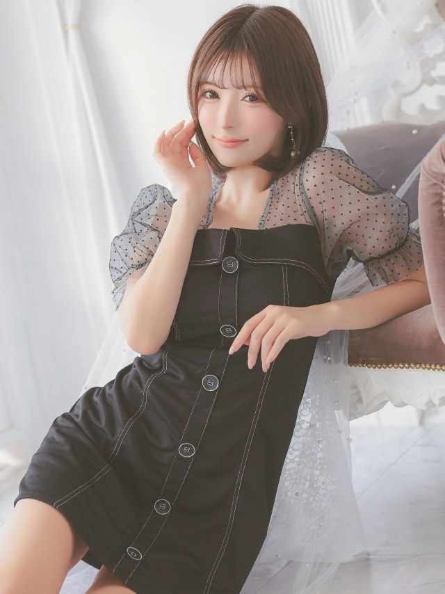 3. 半袖 シアードット柄 パフスリーブ フロントボタンデザイン 胸元カバー フレアミニドレス (Sサイズ~Lサイズ) (聖菜/キャバドレス着用)