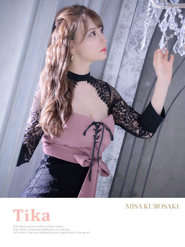 キャバドレス ミニ丈 セクシー 袖あり キャバクラ クラブ ラウンジ Tika ティカ 編み上げバストカットウエストリボンスカラップレース長袖タイトミニドレス