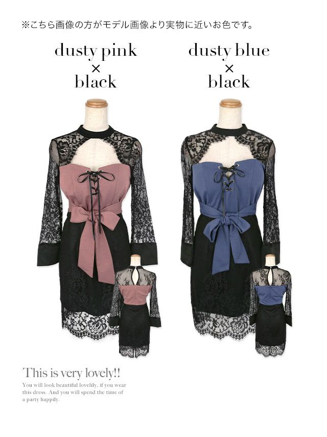 バストレースアップウエストリボンフラワーレース切替長袖バイカラータイトミニドレスのカラーバリエーション