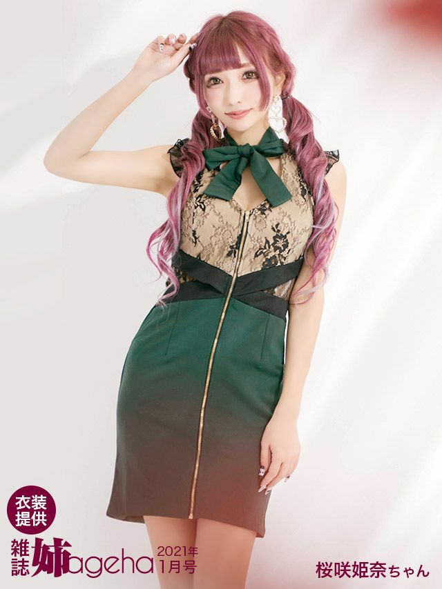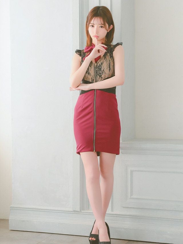3. チョーカーネックリボン フラワーレース フリル袖 ノースリーブ フロントジップ くびれ タイトミニドレス (Sサイズ~XLサイズ) (明日花キララ/キャバドレス着用)