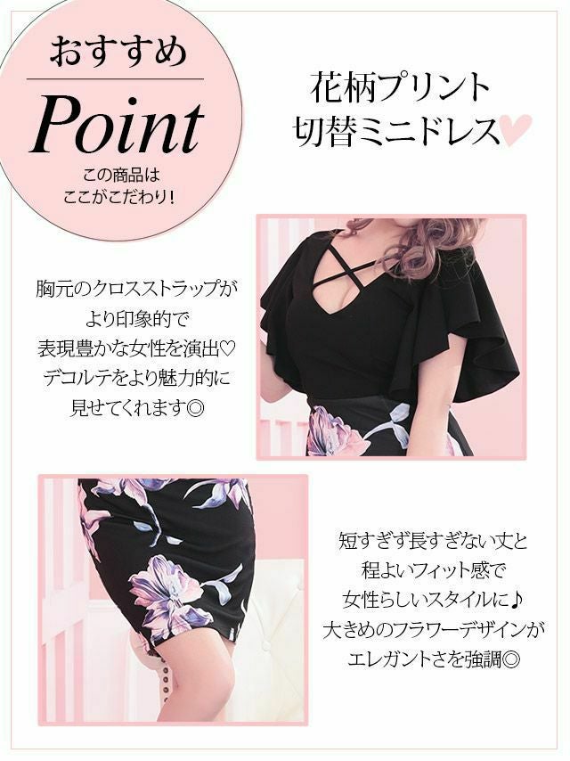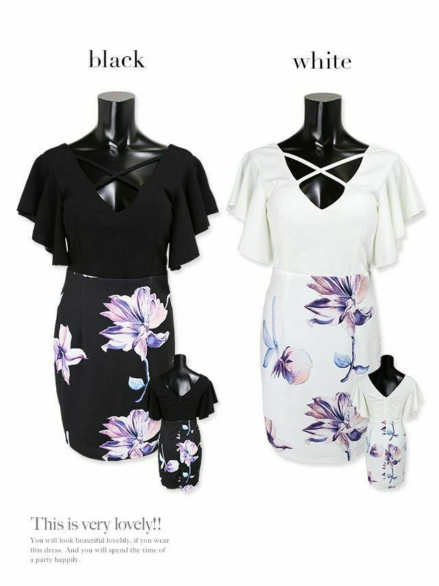定番デザインで安心感抜群 フレアスリーブクロスライン花柄タイト半袖ドレス (Sサイズ~XXLサイズ) (さくりな/キャバドレス着用)