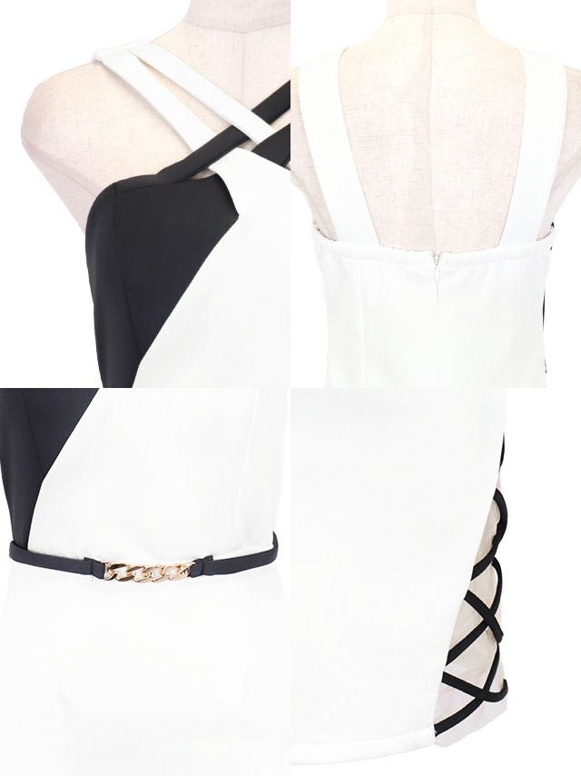 ヘルシーな肌魅せが印象的♪ バイカラーダブルクロスネックサイドシアー切替タイトミニドレス (Sサイズ~XXXLサイズ) (めぐりっぷ/キャバドレス着用)