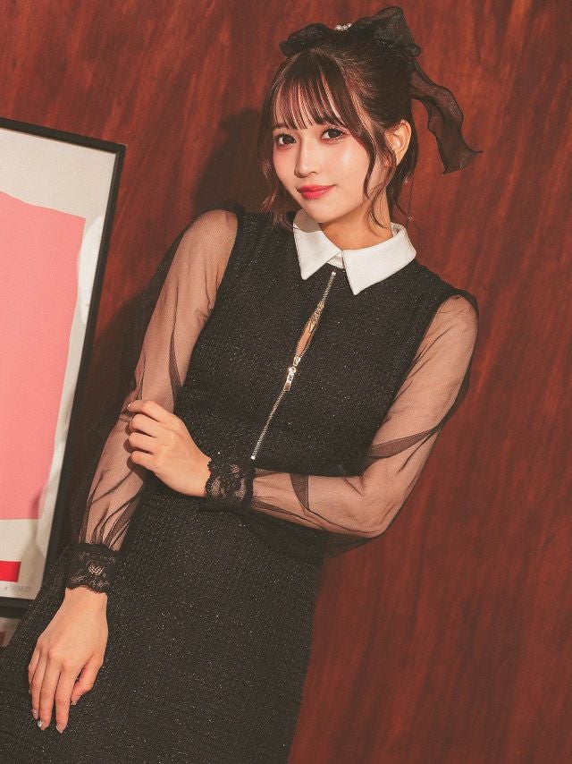 お嬢様チックなモテワンピ♡ ワンピース Aライン ミニドレス 長袖 谷間 ジップ 大人 上品 ハイネック ツイード 襟付き シアースリーブ 胸元カバー ブラジャーのまま 同伴 (黒嵜菜々子着用)