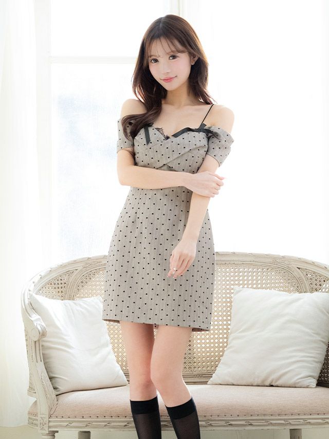 3. ミニドレス ドット柄 肩あき リボン レース ハート グレージュ XL タイト キャバドレス (聖菜着用) [tk-mdij2310]