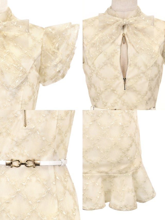 ミニドレス タイト 谷間 ノースリーブ 上品 チェック柄 ウエストベルト付き ブラジャーのまま バストジップ ネックリボン 刺繍 裾フリル ピンクベージュ XL キャバドレスのスペック表