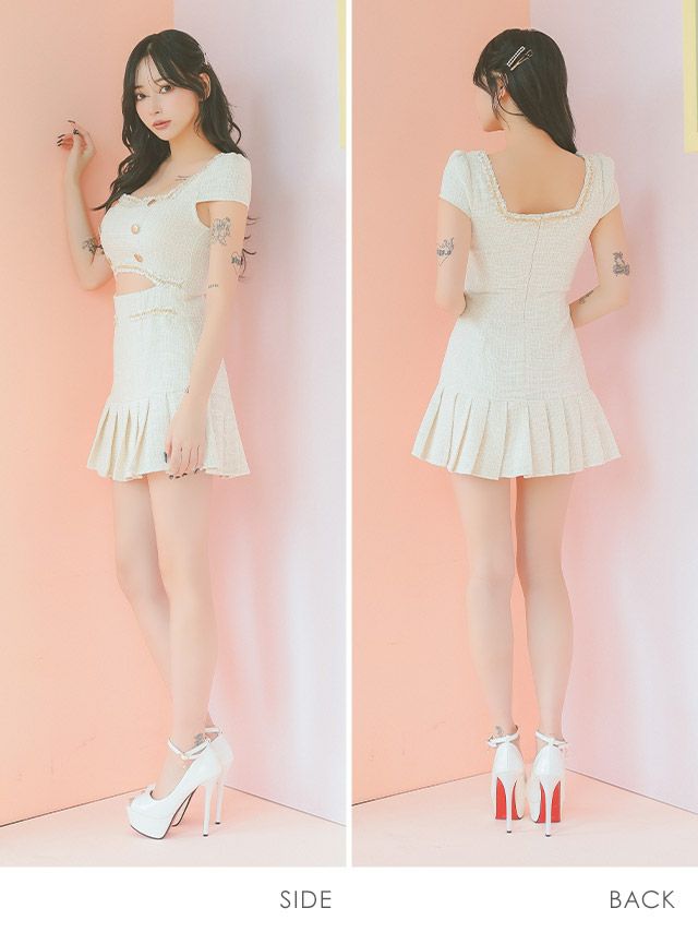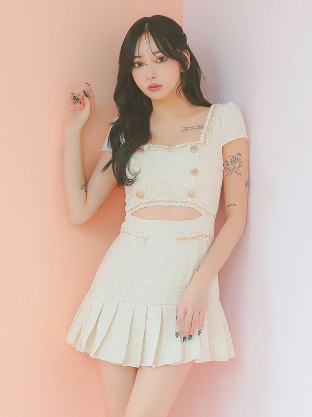 韓国っぽさ溢れる美スタイルドレス♪ ワンピース Aライン ミニドレス 上品 ツイード 半袖 ウエストカット ブラジャーのまま スクエアネック ダブルボタン プリーツ (戦慄かなの PyunA.着用)