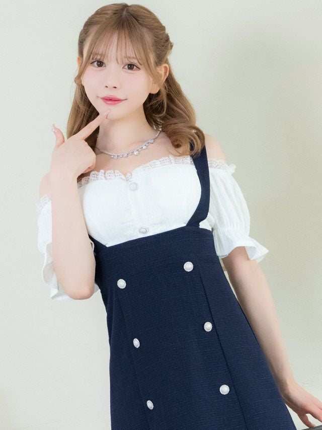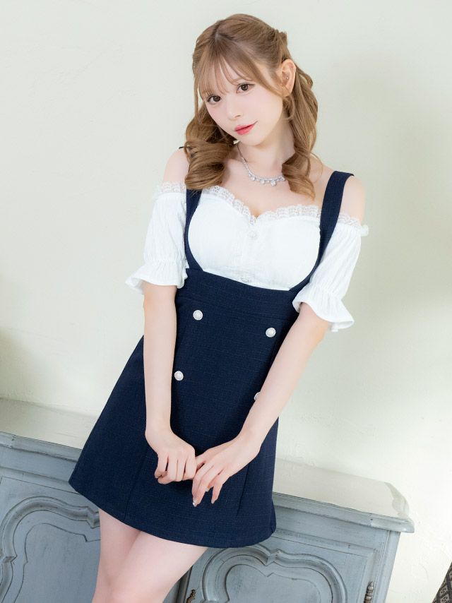 5. 肩出し 二の腕カバーシフォンパフスリーブ切り替えツイードダブルボタンサロペット風フレアミニドレス (Sサイズ~XLサイズ) (若林萌々/キャバドレス着用)