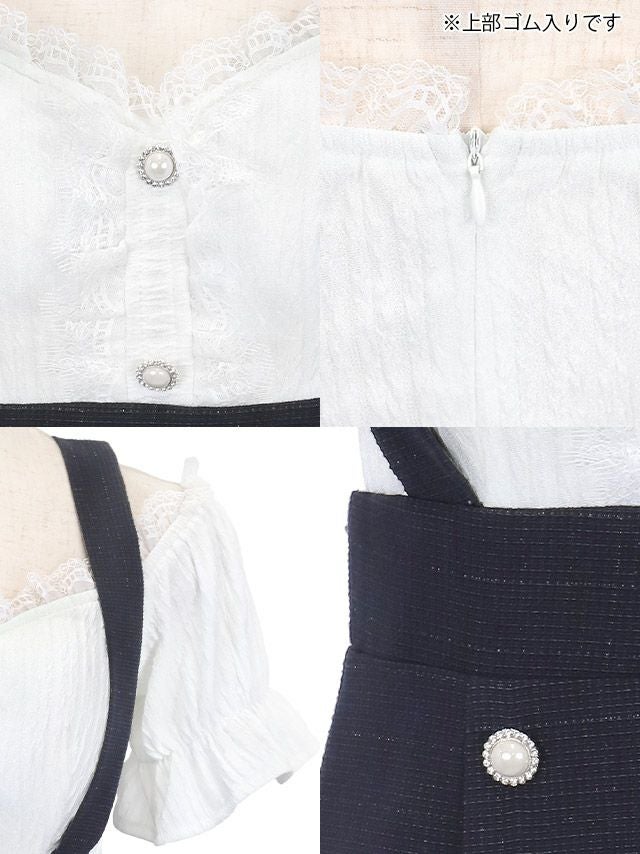 肩あきシフォンパフスリーブ切り替えツイードダブルボタンサロペット風フレアミニドレスのカラーバリエーション