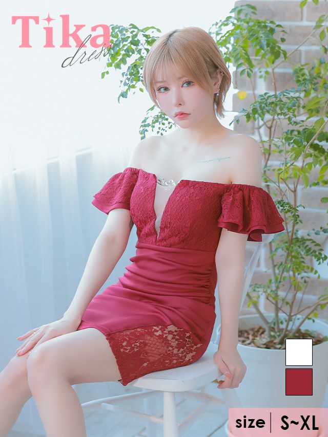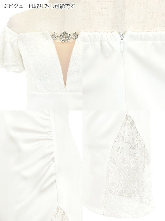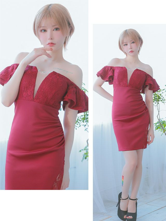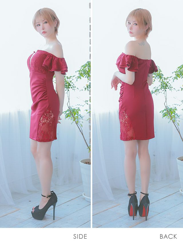 5. ビジューチャーム付き オフショルダー バストシースルー フラワーレース フリル袖 谷間魅せ レーススリット タイトミニドレス (Sサイズ~XLサイズ) (PyunA./キャバドレス着用)