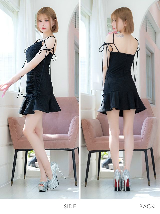 4. ミニドレス キャミソール コード レース 谷間見せ ドロスト 裾フリル ラメ ストレッチ タイト 黒 キャバドレス (戦慄かなの着用) 【tk-mdjj7648】