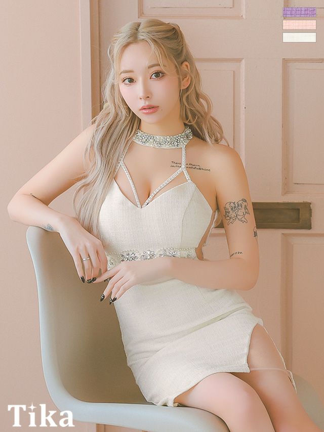 4. ミニドレス ツイード バストコード 谷間 くびれ透け ビジュー ホルターネック ピンク タイト キャバドレス (重川茉弥着用) [tk-mdjj93018b]