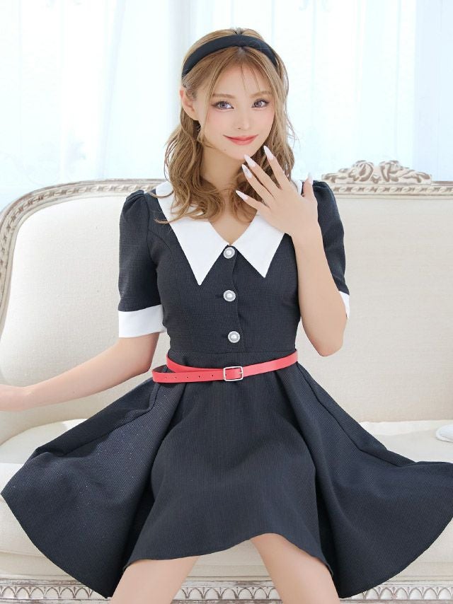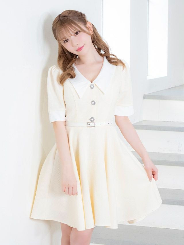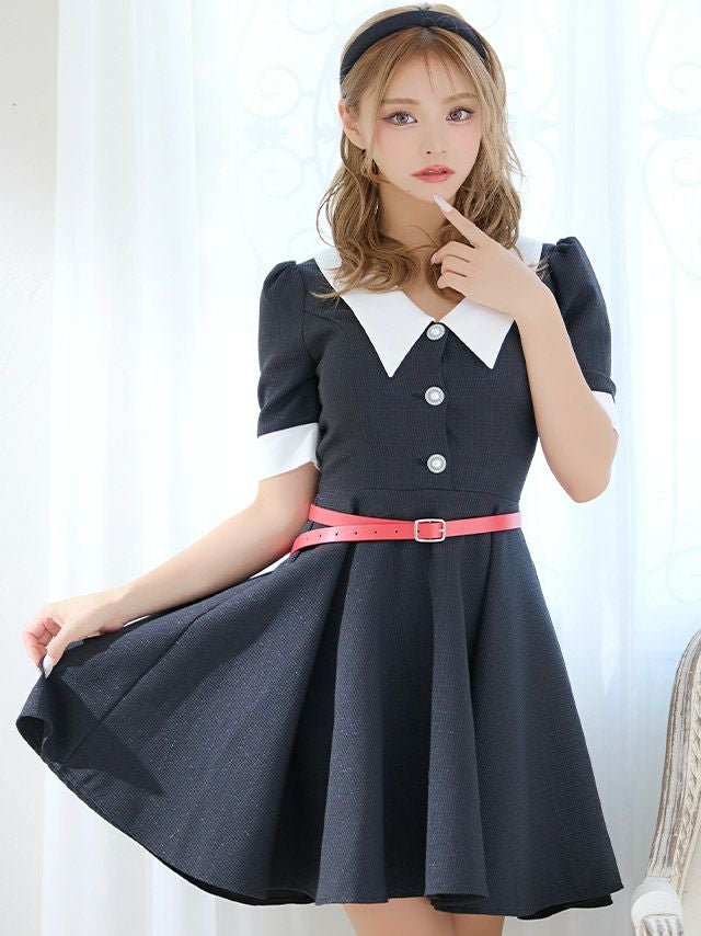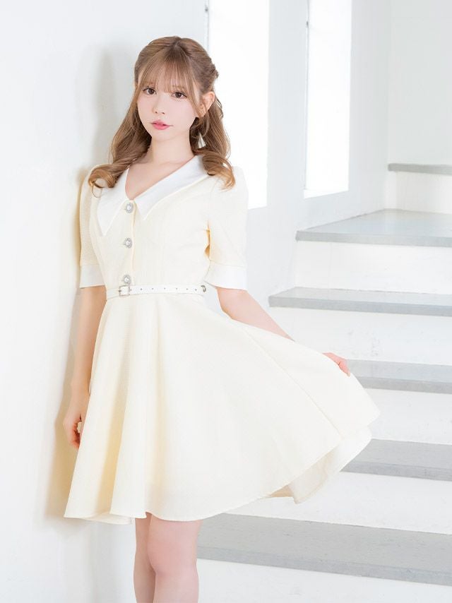 5. 襟付き ウエストベルト付き ツイード ラメデザイン 袖あり 五分袖 胸元カバー フレアミニドレス (Sサイズ~XLサイズ) (若林萌々/キャバドレス着用)