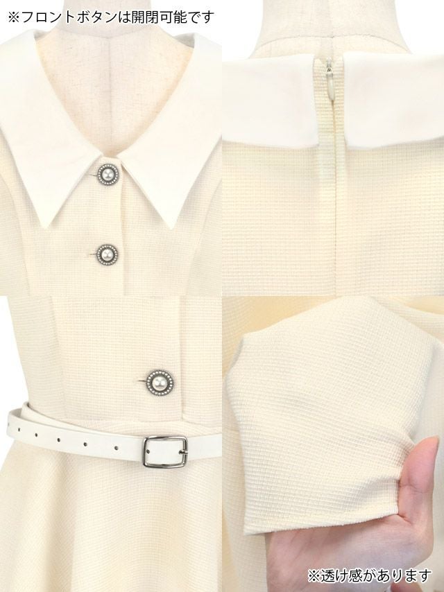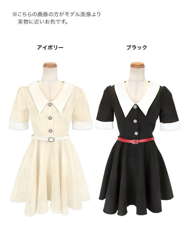 襟デザインウエストベルト付きツイードラメデザイン袖あり膝丈フレアミニドレスのカラーバリエーション