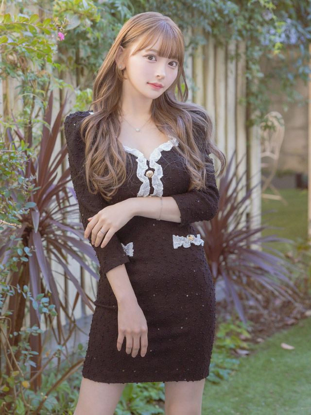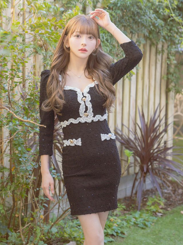 メイン画像 キャバドレス 韓国 ミニドレス 袖あり パイピング モノトーン ニット ストレッチ タイト キャバドレス (重川茉弥着用) [tk-mdk889-907]