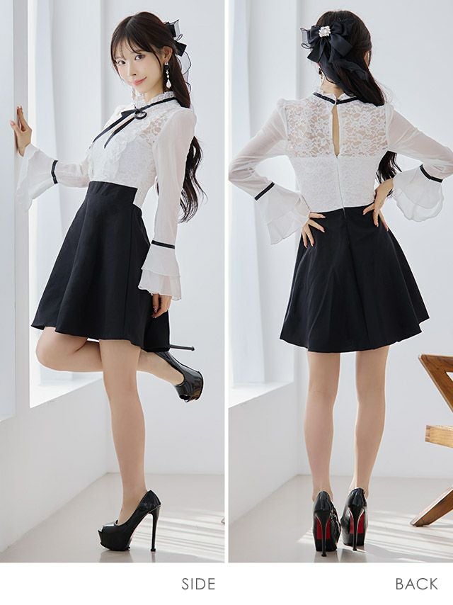 4. [韓国ドレス] レース胸あきネックリボン長袖 袖ありパフスリーブハイウエスト切替フレアミニドレス (Sサイズ~Lサイズ) (緩苺/キャバドレス着用)