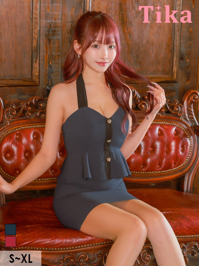 タイト ミニドレス 谷間 ストレッチ ペプラム ホルターネックリボン ワッフル バイカラー ゴールドボタン キャバドレスのサイズ表