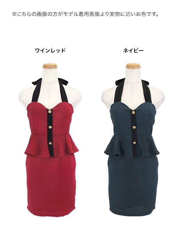 タイト ミニドレス 谷間 ストレッチ ペプラム ホルターネックリボン ワッフル バイカラー ゴールドボタン キャバドレスのカラーバリエーション