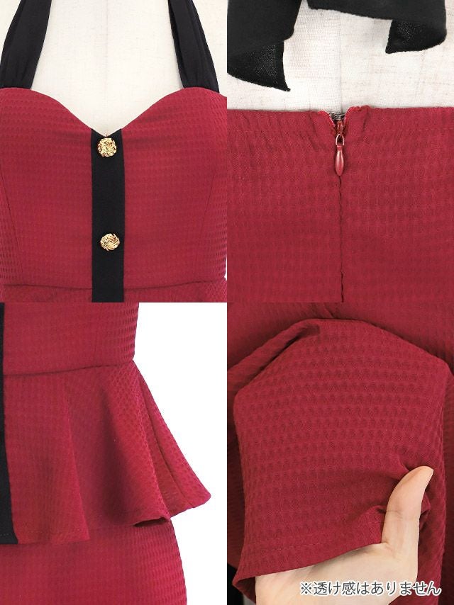 3. ミニドレス ペプラム 谷間 ストレッチ ホルターネックリボン ワッフル素材 バイカラー XL 赤 タイト キャバドレス (黒嵜菜々子着用) [tk-mdlb6005]