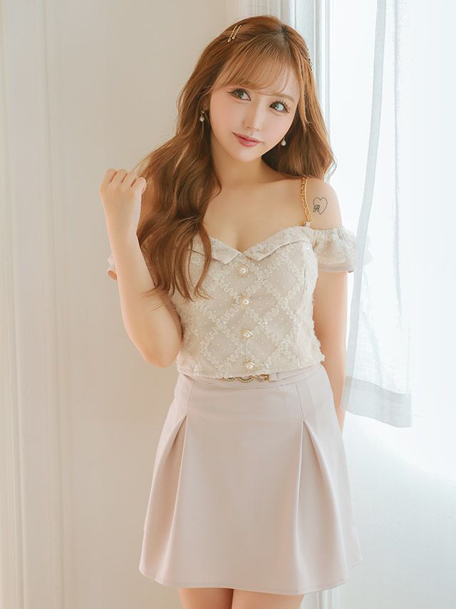 5. [SALE] 肩出しチェーンショルダーチュールセットアップウエストベルト付きボックスプリーツフレアミニドレス (Sサイズ~Lサイズ) (りせり/キャバドレス着用)