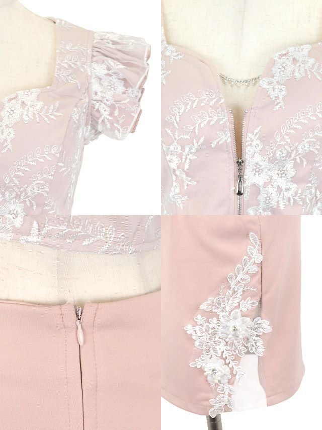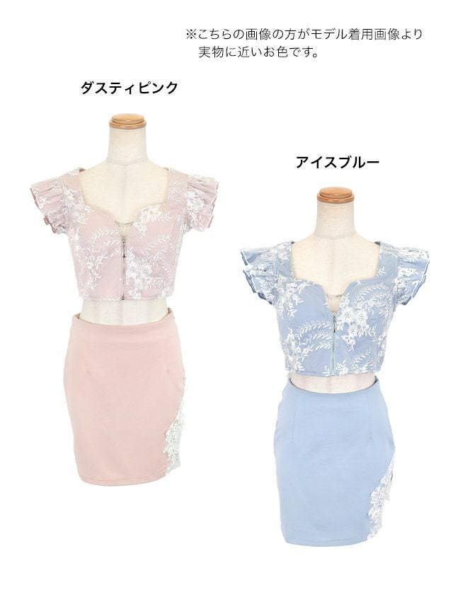 sexyかつフェミニンな女性を演出♪ [SALE] フリル袖バストジップビジューフラワー刺繍チュールセットアップタイトミニドレス (Sサイズ~XLサイズ) (聖菜/キャバドレス着用)